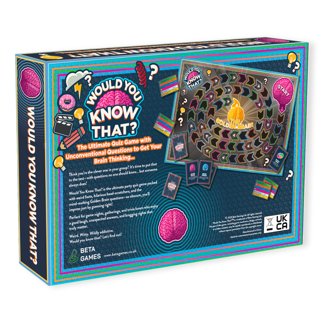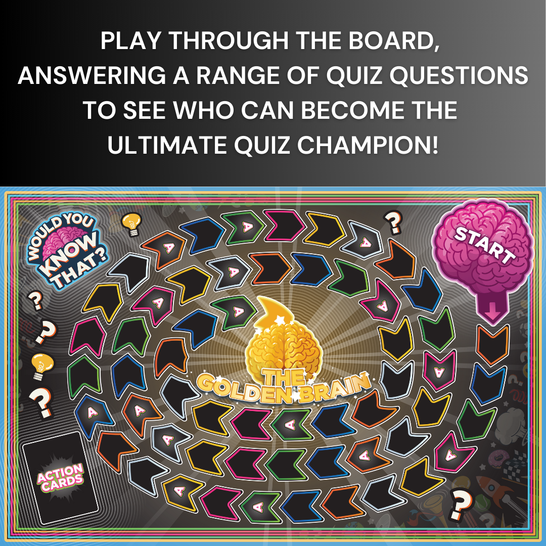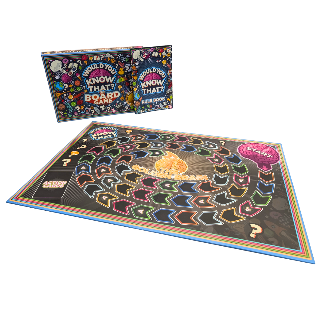 Would You Know That? is the ultimate quiz board game for families, friends, and party lovers! Packed with fascinating questions across a variety of topics, this game brings laughter, learning, and friendly competition to any occasion. Players move around the board by answering questions correctly, but the real twist comes at the end – the Golden Brain Challenge, where one final question stands between you and victory!